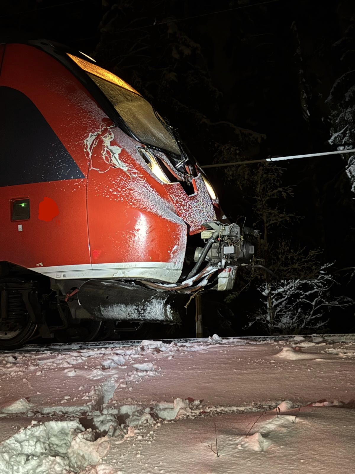 Ein Zug war gegen 00:15 Uhr mit einem Baum kollidiert, der in die Fahrbahn hineingeragt hatte. Dabei wurde die Oberleitung beschädigt, sodass eine Weiterfahrt nicht mehr möglich war.