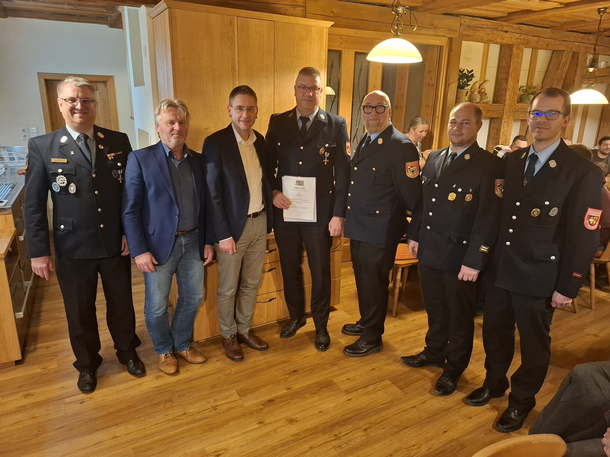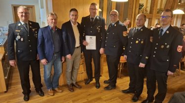 Bild Unterschrift von rechts: 2. KDT Thomas Köhler, KBM Dominic Brosel, KBI Christian Schmidt, Jubilar für 40 Jahre Wolfgang Betz, Landrat Dr. Ludwig, Bürgermeister Herbert Albrecht, 1. KDT Daniel Mogge