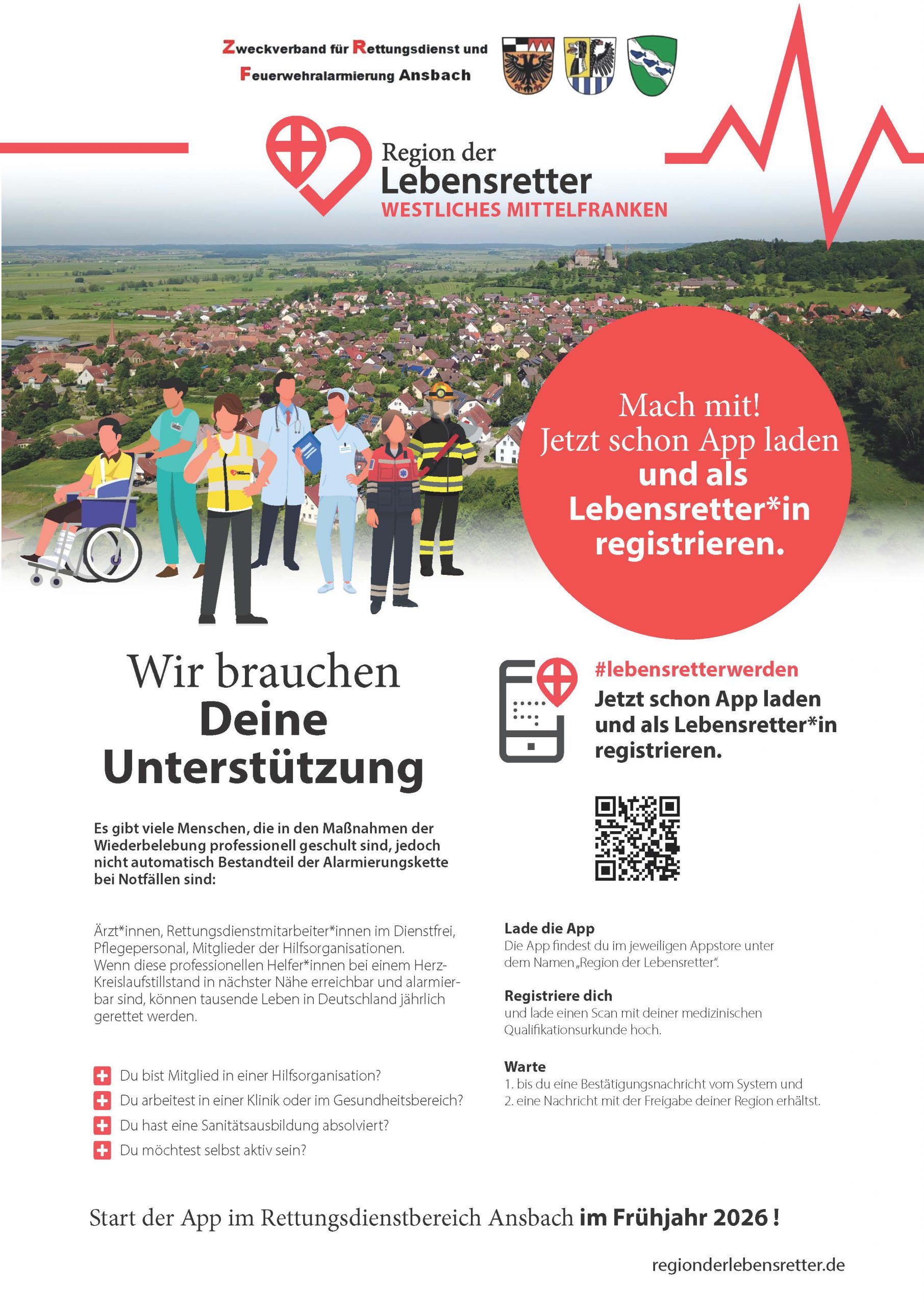Bei einem Herzstillstand zählt jede Sekunde. Mit der App „Region der Lebensretter” wird im Rettungsdienstbereich Ansbach ein etabliertes System eingeführt. Dieses alarmiert qualifizierte und registrierte Ersthelferinnen und Ersthelfer über ihr Smartphone, wenn ein Notfall in ihrer Nähe eintritt. Träger des Projekts ist der Zweckverband für Rettungsdienst und Feuerwehralarmierung (ZRF) Ansbach. Der Start ist für das Frühjahr 2026 geplant. „Die ‚Region der Lebensretter‘ ist eine wertvolle Ergänzung unserer Rettungskette.